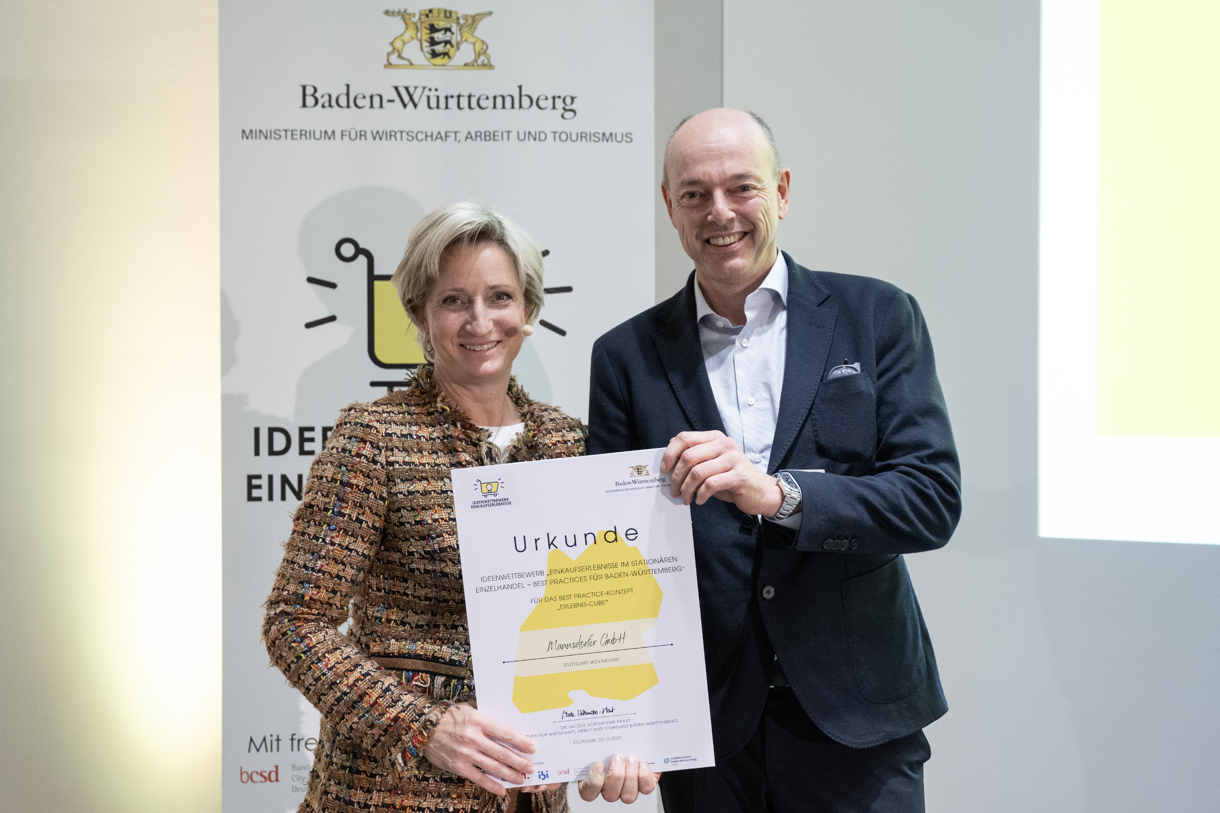 Unser innovativer Schlafcube ist ein Projekt im Rahmen der „Einkaufserlebnisse im stationären Einzelhandel – Best Practices für Baden-Württemberg“ und wurde von Frau Wirtschaftsministerin Dr. Hoffmeister-Kraut ausgezeichnet.