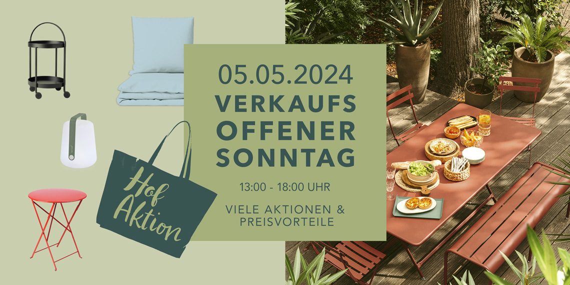 Unser Bistroteam verwöhnt Sie in gewohnter Weise im Innenhof mit Pasta-Varianten und Soßenkreationen, sowie ausgewählten Weinen und Cocktails. Auch alkoholfrei ein Genuss! ALT gegen NEU – Kissen und Zudecken Aktion: Gegen die Zurückgabe des alten Kopfkissens und alte Zudecken und beim Kauf eines neuen Kissens und Zudecke erhält man 10% Nachlass. Bei der Gartenmöbel Aktion gibt es am Sonntag 10% Nachlass auf alle Gartenmöbel ab einem Einkaufswert von 500,00 €.