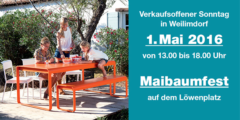 Pünktlich zum Start in den Mai feiert WeilAktiv mit allen Weilimdorfern und Besuchern sein traditionelles Maibaumfest mit Hocketse sowie dem gleichzeitig stattfindenden Verkaufsoffenen Sonntag. Die Geschäfte sind am Maifeiertag von 13 bis 18 Uhr geöffnet.